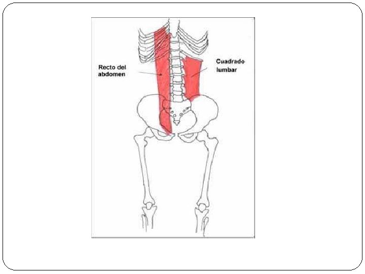 �Músculo cuadrado lumbar. Se inserta en la cresta ilíaca, en la última costilla y en las vértebras lumbares. Al contraerse inclina el tronco hacia el mismo lado, al contraerse ambos lados se tira hacia abajo de la última costilla y se efectúa la espiración forzada.