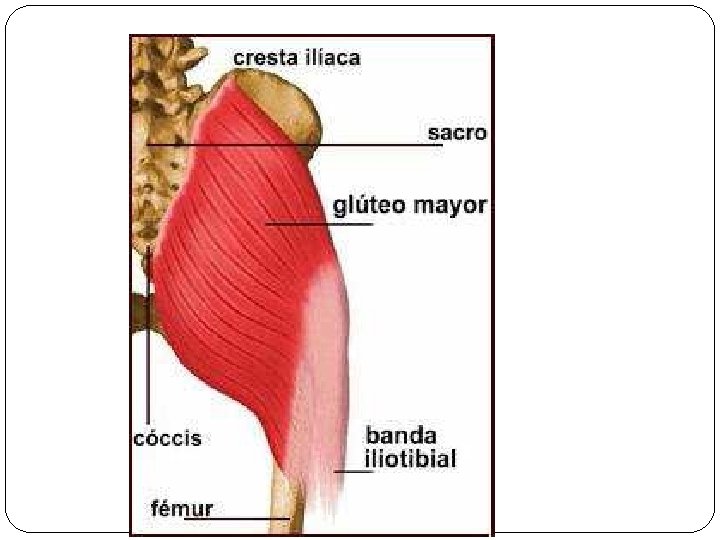 �Músculo psoalíaco. Formado por dos porciones, músculo psoas y músculo ilíaco. Producen la flexión de la columna sobre la pelvis. �Músculos glúteos. Son tres, mayor, mediano y menor. Por su parte superior se insertan al hueso coxal y en el sacro. Sus tendones inferiores se insertan en al cara posterior del fémur. Son muy importantes para mantener al estática del cuerpo.