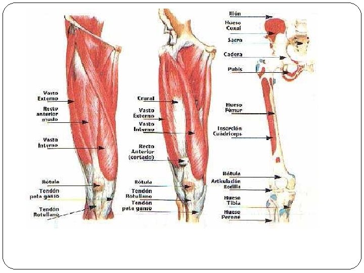 �Músculos cuádriceps crurales. Formados por cuatro porciones que se insertan en el fémur y en el coxal, en su parte inferior se unen al tendón rotuliano en cuyo espesor se encuentra la rótula. Es un músculo potente, se encarga de la extensión de la pierna �Músculos aductores. Su parte superior se inserta en la pelvis y al inferior en el fémur. Están en la cara interna del muslo.