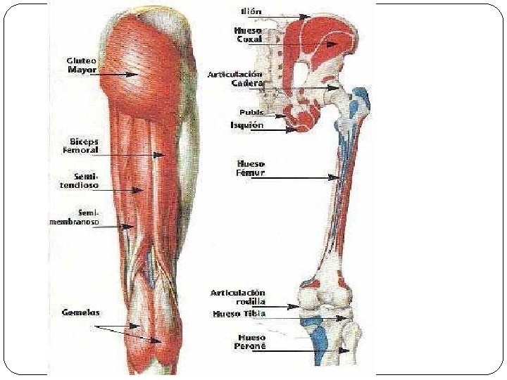 �Músculos dorsales del muslo (semimembranoso, semitendinoso y bíceps crural). Sus extremos superiores se insertan en fémur y los extremos inferiores en la epífisis superior y la cara posterior de la tibia y el peroné. Su función consiste en flexionar la pierna sobre el muslo.