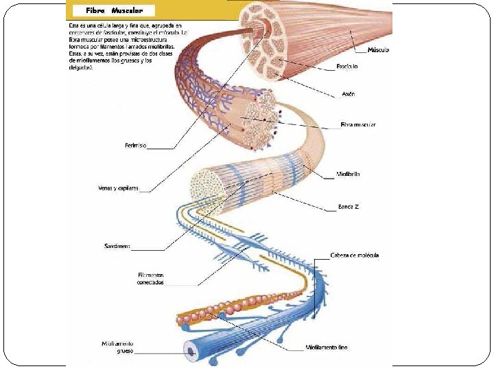 �Una fibra muscular típica mide entre 2 -3 cm de largo por 0, 05 mm de diámetro y se componen de estas estructuras más estrechas llamadas miofibrillas, que contienen miofilamentos, numerosos capilares suministran oxígeno y glucosa necesarios para la contracción.