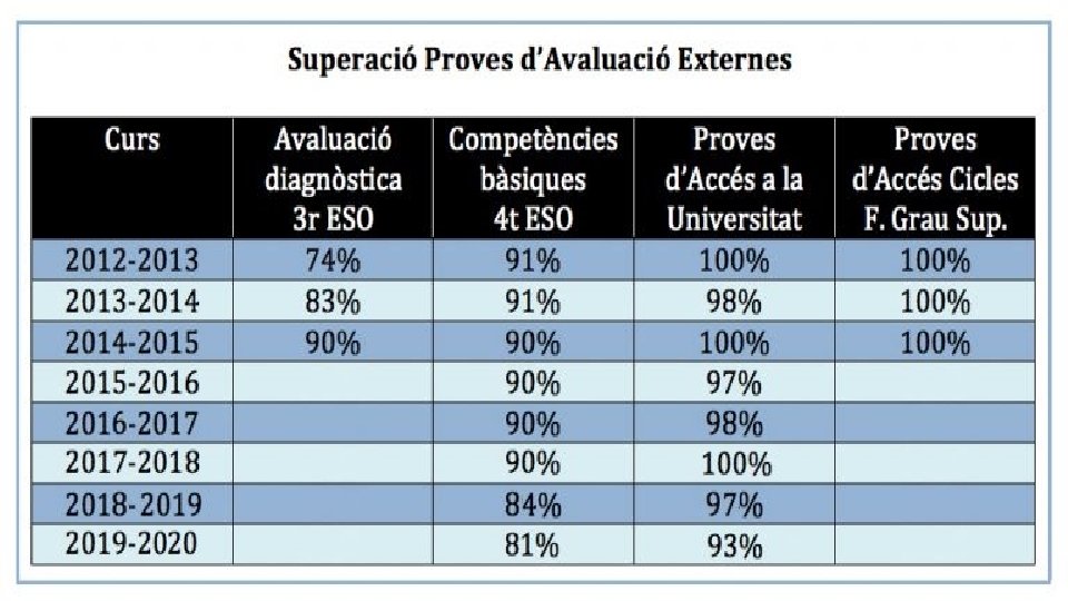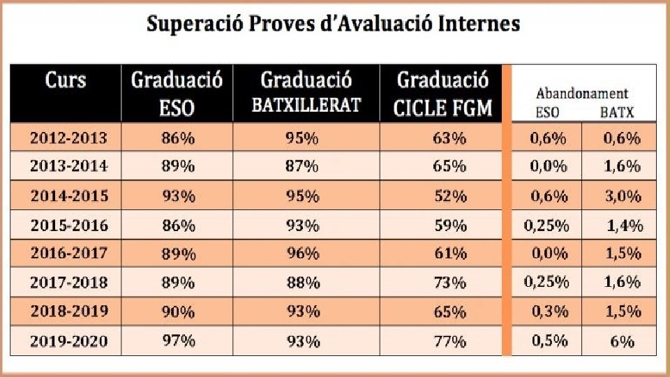 Resultats acadèmics curs 2019 -2020 TOT APROVAT: 74 % 1 -2 SUSPESES: 13 % 3 -4 SUSPESES: 4 % MÉS DE 4 INSUFICIENTS: 9 %