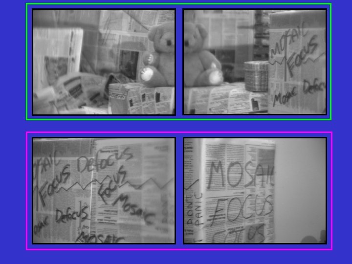 What else? n Multi-dimensional Mosaics - Simultaneously Dynamic Range & Spectrum & Polarization etc. Generalized Mosaicing: Yoav Schechner and Shree Nayar