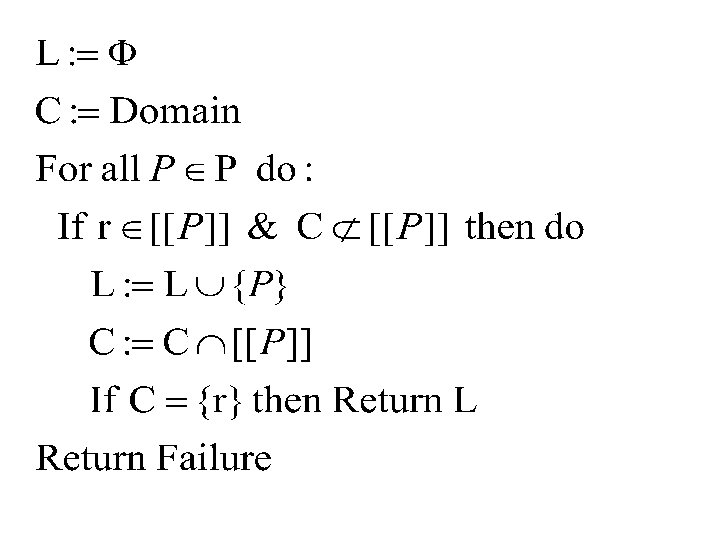 • • r = individual to be described P = list of properties, in preference order P is a property L= properties in generated description (Recall: we’re not worried about realization today)