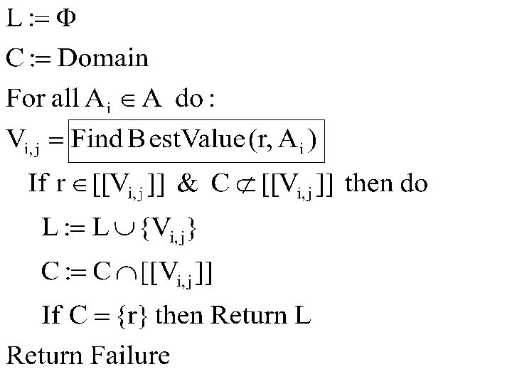 • Find. Best. Value(r, A): - Find Values of A that are true of r, while removing some distractors (If these don’t exist, go to next Attribute) - Within this set, select the Value that removes the largest number of distractors - If there’s a tie, select the most general one - If there’s still a tie, select an arbitrary one