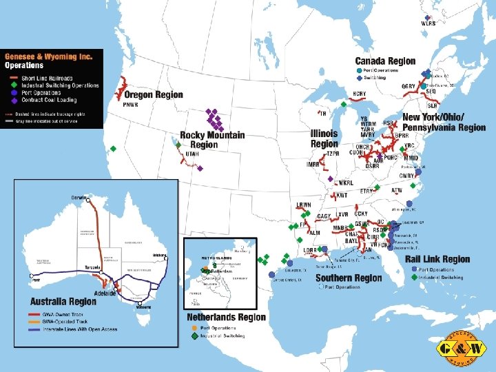 Genesee & Wyoming Inc. Overview • • • Listed on New York Stock Exchange (“GWR”) • Provide rail service in the U. S. , Canada, Australia, and Europe • • 580 locomotives Market Capitalization ~ $2. 4 billion 63 Railroads with $775 million of annual revenue Employ ~ 2, 500 Operate ~ 10, 000 track miles (owned/leased/access) 17 ports and contract coal loading in Powder River Basin Lease/own ~ 13, 000 railroad cars