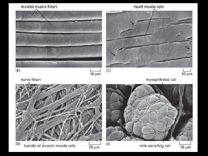 Muscle v “Muscle” includes many cell types, all specialized for contraction but in other respects dissimilar. Mammals possess FOUR MAIN categories of cells specialized for contraction: 1. Skeletal muscle cells, 2. Heart (cardiac) muscle cells, 3. Smooth muscle cells, 4. Myoepithelial cells. v These differ in function, structure, and development. v Although all of them generate contractile forces by using organized filament systems based on actin and myosin II. v The actin and myosin molecules employed have somewhat different amino acid sequences, are differently arranged in the cell, and are associated with different sets of proteins that control contraction.