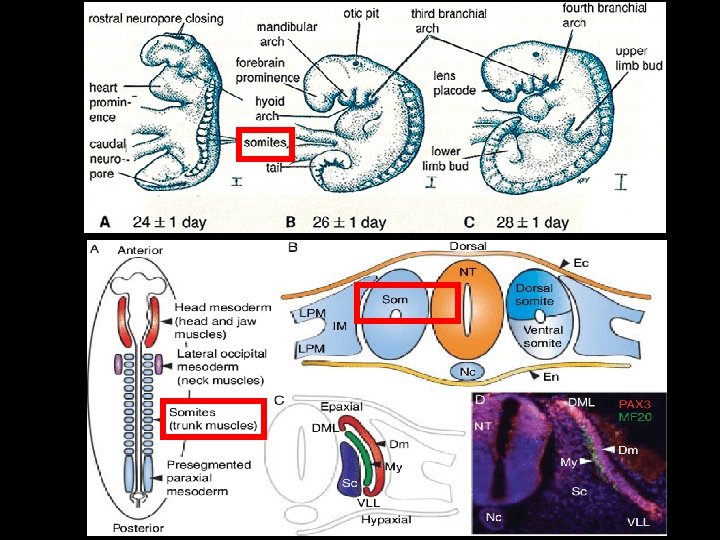 Myoblasts Fuse to Form New Skeletal Muscle Fibers v. During development, certain cells, originating from the SOMITES of a vertebrate embryo at a very early stage, become determined as MYOBLASTS, the precursors of skeletal muscle fibers. v. After a period of proliferation, the myoblasts undergo a dramatic change of state: Øthey stop dividing, switch on the expression of a whole battery of muscle -specific genes required for terminal differentiation. Øand fuse with one another to form multinucleate skeletal muscle fibers. v. Once differentiation and cell fusion have occurred, the cells do not divide and the nuclei never again replicate their DNA.