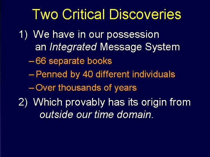 The Principal Discovery Job Genesis, Exodus, Leviticus, Numbers, Deuteronomy Joshua Judges, 1 & 2 Samuel, 1 & 2 Kings 1 & 2 Chronicles, Ezra, Nehemiah Esther Psalms Proverbs, Ecclesiastes Isaiah Jeremiah, Lamentations Ezekiel Daniel Minor Prophets Matthew Luke John, 1, 2, 3 John, Revelation Mark, 1, 2 Peter 14 epistles James Jude 66 books ? Moses ? Samuel ? Ezra ? David + Solomon + Isaiah Jeremiah Ezekiel Daniel The 12 Matthew Luke John Peter Paul James Jude 40 + ~2000 years