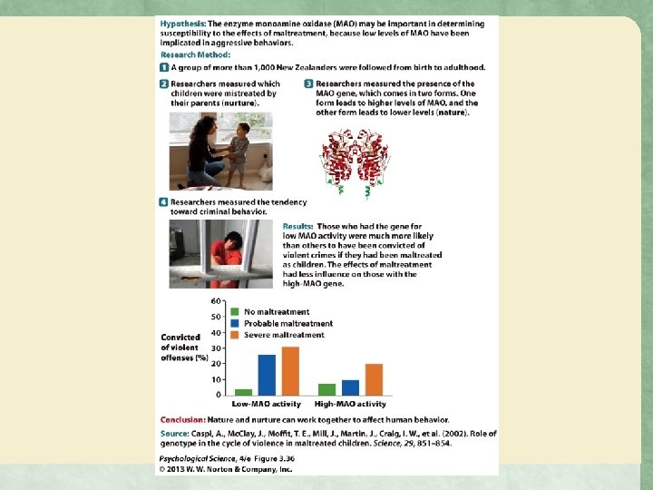 Social and Environmental Contexts Influence Genetic Expression • Caspi et al. (2002) followed more than 1, 000 New • • Zealanders from birth until adulthood Every few years information was collected about the participants When the participants were 26 years old, investigators examined which factors predicted who had become a violent criminal Mistreatment at home + low MAO gene accounted for nearly 50 percent of criminality Study is a good example of how genes and social context interact to affect behavior (phenotype)