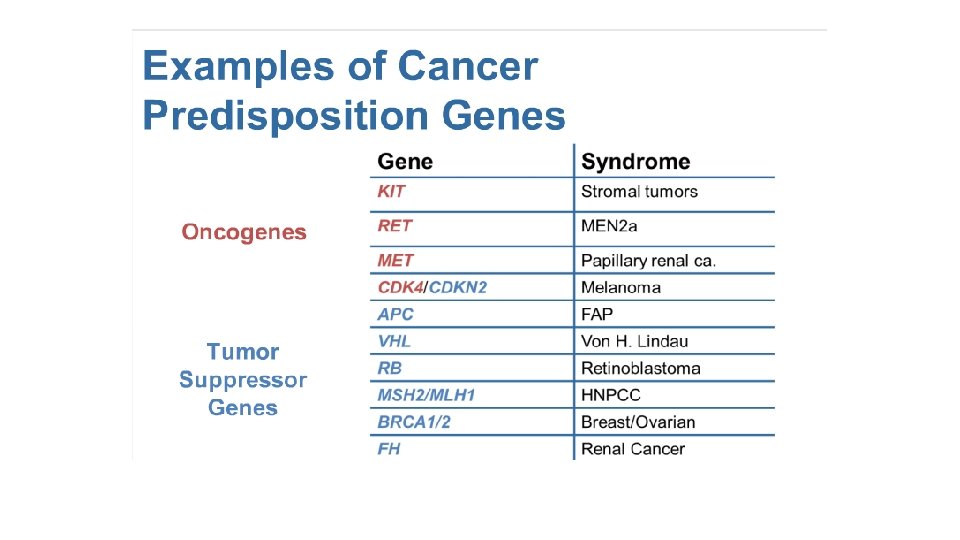 Genomics of Cancer • “Cancer is a disease of the genome” • Types of cancer genes • Oncogenes – proto-oncogenes help cells grow, but when it has a mutation it becomes an oncogene and causes the cell to grow out of control • Mostly acquired mutations, chromosome rearrangements, gene duplication • Examples of inherited oncogene: RAS • Tumor suppressors – genes that slow down division, repair DNA mistakes, or tells cells when to die • Examples of inherited tumor suppresors: p 53, BRCA 1 Beth Balkite & Rachel Mills Duke OLLI Spring 2017