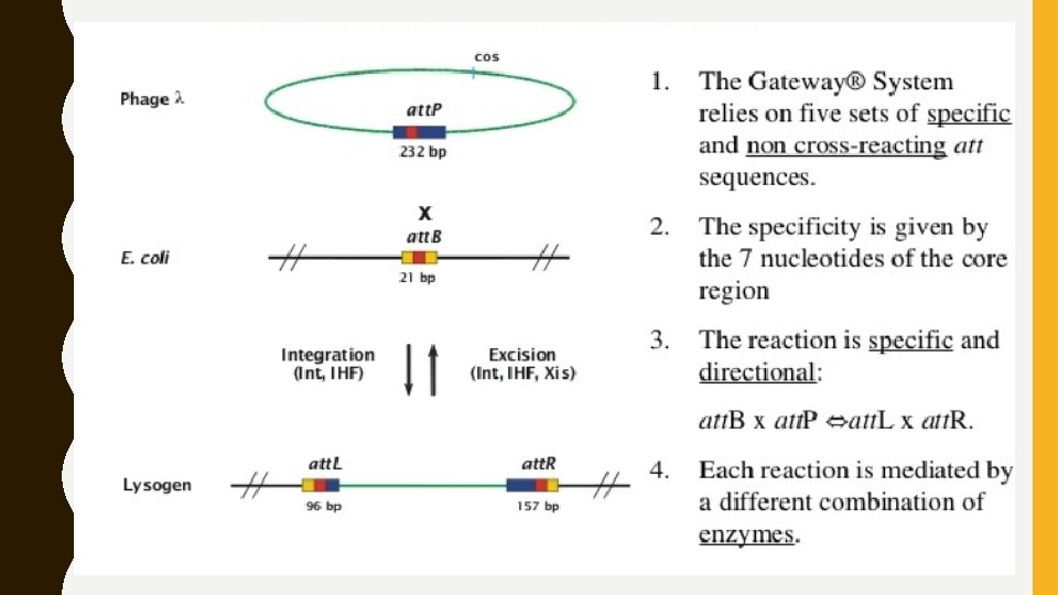• Phage lambda is a bacteriophage or phage, i. e. bacterial virus, that uses E. coli as host. • • Its structure is that of a typical phage: head, tail fibres. • • Lambda viral genome: 48. 5 kb linear DNA with a 12 base ss. DNA "sticky end" at both ends; these ends are complementary in sequence and can hybridize to each other (this is the cos site: cohesive ends). • • Infection: lambda tail fibres adsorb to a cell surface receptor, the tail contracts, and the DNA is injected. • • The DNA circularizes at the cos site, and lambda begins its life cycle in the E. coli host.