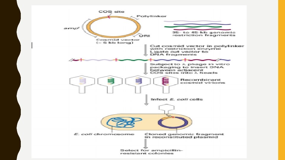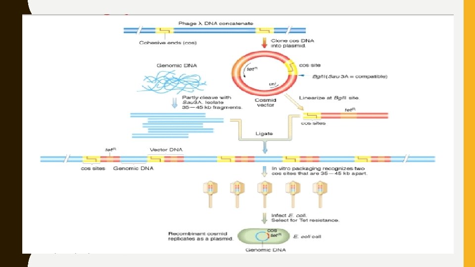 COSMID VECTORS=COS+ PLASMID • Cosmid vector • is a combination of the plasmid vector and the COS site which allows the target DNA to be inserted into the λ head. It has the following advantages: – High transformation efficiency. – The cosmid vector can carry up to 45 kb whereas plasmid and λ phage vectors are limited to 25 kb.