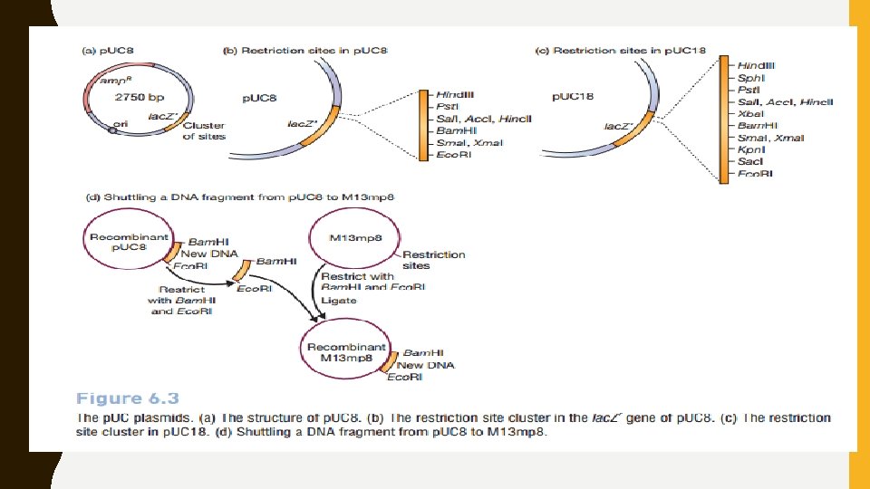 PUC 8—A LAC SELECTION PLASMID • is descended from p. BR 322, although only the replication origin and the amp. R gene remain. The nucleotide sequence of the amp. R gene has been changed so that it no longer contains the unique restriction sites: all these cloning sites are now clustered into a short segment of the lac. Z′ gene carried by p. UC 8. three important advantages that have led to it becoming one of the most popular E. coli cloning vectors. • 1 - the manipulations involved in construction of p. UC 8 were accompanied by a chance mutation, within the origin of replication, which results in the plasmid having a copy number of 500– 700 even before amplification. This has a significant effect on the yield of cloned DNA obtainable from E. coli cells transformed with recombinant p. UC 8 plasmids. • 11 is that identification of recombinant cells can be achieved by a single step process, by plating onto agar medium containing ampicillin plus X-gal. (With both p. BR 322 and p. BR 327, selection of recombinants is a two-step procedure, requiring replica plating from one antibiotic medium to another). • 111 p. UC 8 lies with the clustering of the restriction sites, which allows a DNA