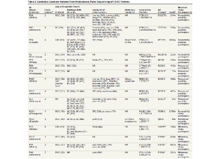 Hereditary cancer syndromes increased risk of gastric cancer Syndrome Genes Hereditary diffuse gastric cancer (HDGC) CDH 1, CTNNA 1, MAP 3 K 6 Lynch syndrome (HNPCC) MLH 1, MSH 2/6, PMS 2 Familial adenomatous polyposis (FAP) APC Li-Fraumeni syndrome TP 53 Juvenile polyposis SMAD 4, BMPR 1 A Peutz-Jeghers syndrome STK 11 Hereditary breast-ovarian cancer (HBOC) BRCA 1/2 Moderate penetrant genes ? PALB 2 ATM PRSS 1 SDHB Stoffel EM J Clin Oncol 2015 Gaston D et al. Plos. One 2014