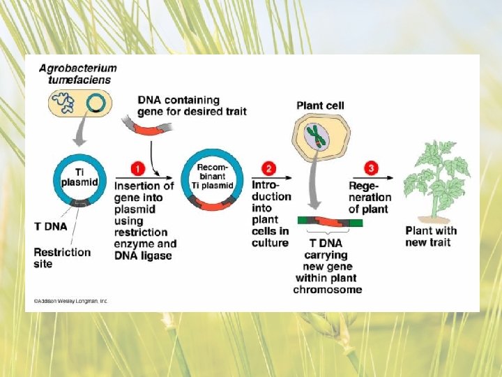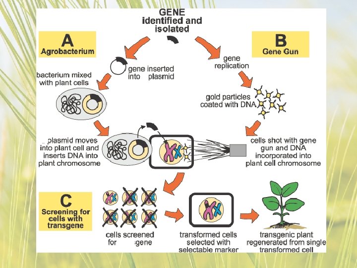 What is Agrobacterium? • This method works especially well for plants like potatoes, tomatoes, and tobacco. • Agrobacterium tumefaciens infection is less successful in crops like wheat and maize.