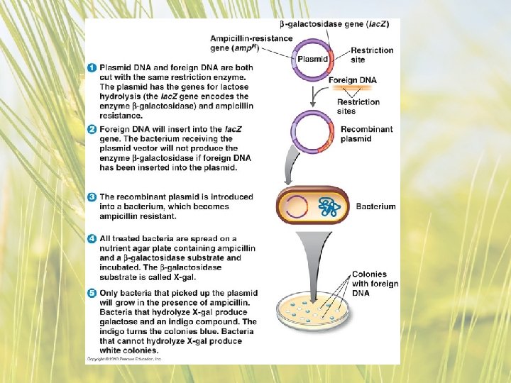 Recap – recombinant DNA 1 - Firstly we use a Restriction Enzymes to cut DNA plasmid at a specific spot, leaving “sticky ends” 2 - We isolate our gene of interest using the same restriction enzymes 3 - Gene of interest inserted using ligase enzyme. It attaches because of the sticky ends. 4 - Plasmid left around a prokaryote bacteria 5 - Bacteria will accept plasmid freely, this is a process called transformation… they think they are useful and just suck them in! 6 - Start producing proteins of those genes