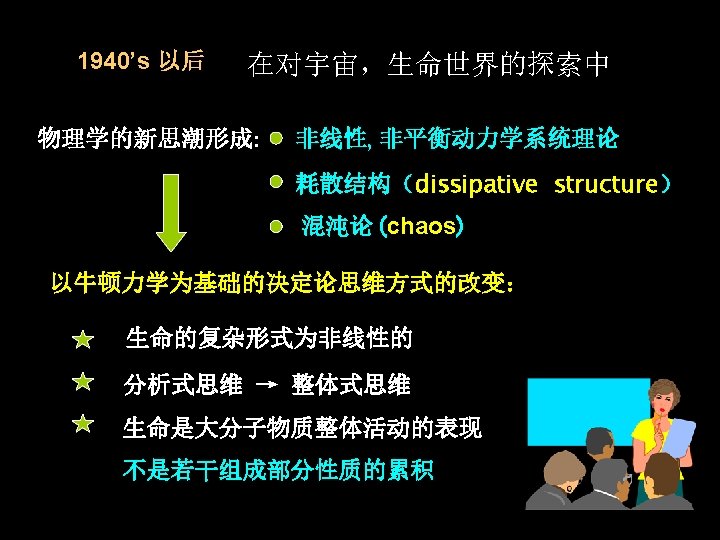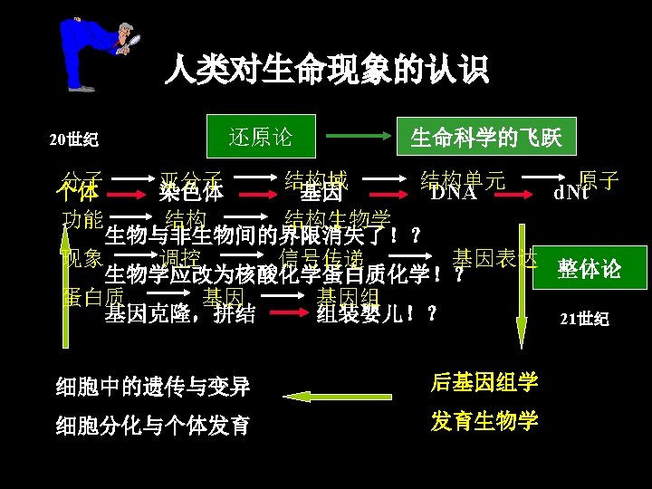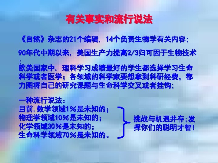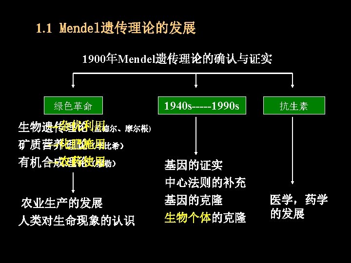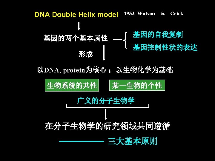 近半个世纪以来 分子生物学中重大突破与成就者 Nobel Prize 生物学发展的里程碑与主要内容 1958 Joshua Lederberg (33 y) J. 莱德伯格(美国人) Phage transduction转染 Beadle & Tatum G. W. 比德乐、E. L. 塔特姆 One gene--one enzyme Joshua Lederberg