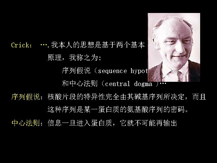 1968(美国人) R. Holley R. 霍利 H. G. Khorana H. G. 霍拉纳 M. Nirenberg M. W. 尼伦伯格 Robert Holley(46 y) t. RNAphe cloverleaf structure H. Gobind Khorana(46 y) How to synthesize triplet RNA Marshall Nirenberg(41 y) Genetic coden