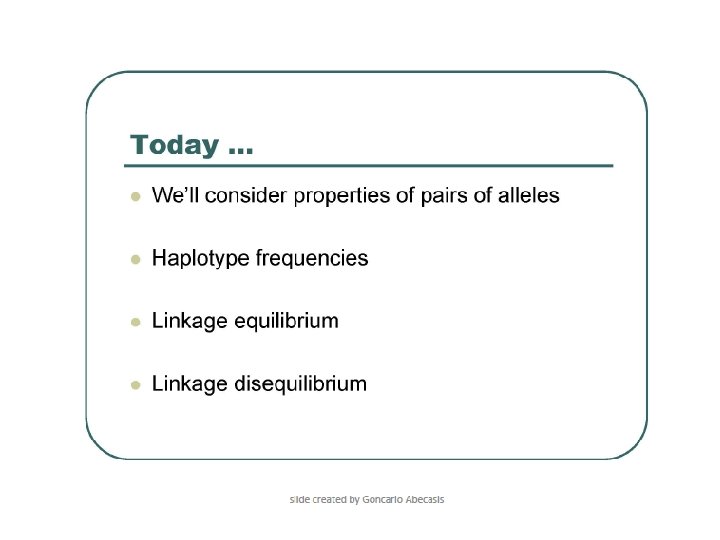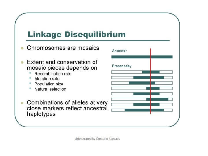 Linkage • The correlation between two markers (R) is a way to measure their linkage. • R=1 indicates that the two markers are completely linked. • R=0 indicates that the two markers segregate randomly. • R 2 measures the loss of information when marker A is replaced by marker B.