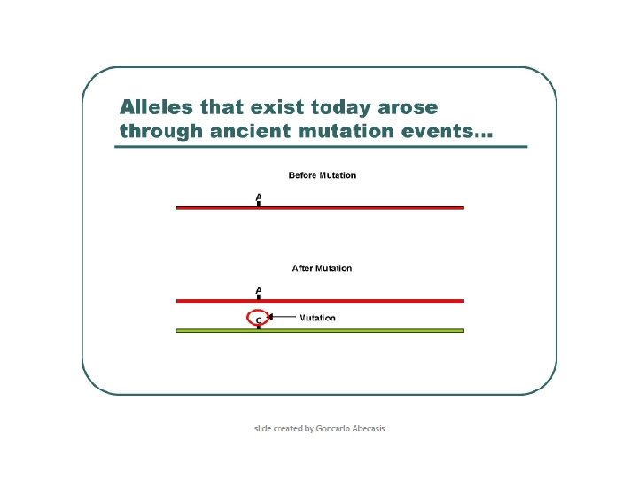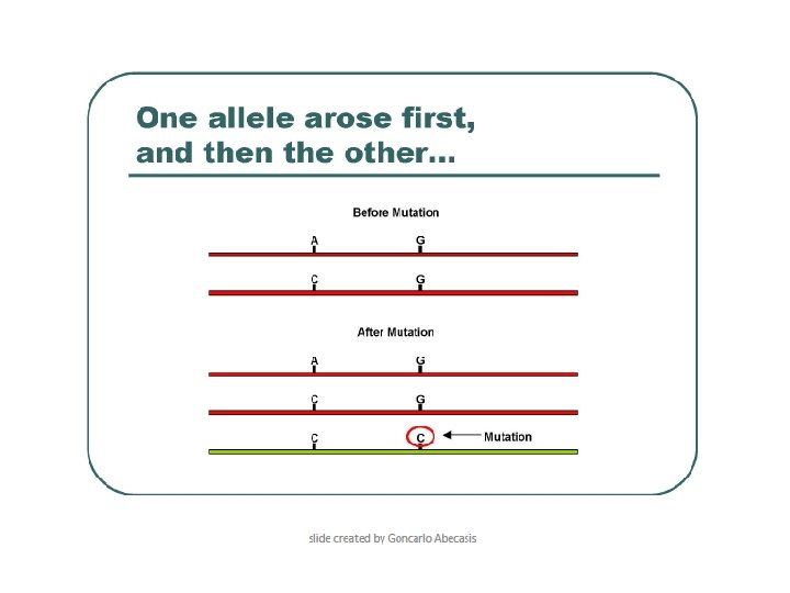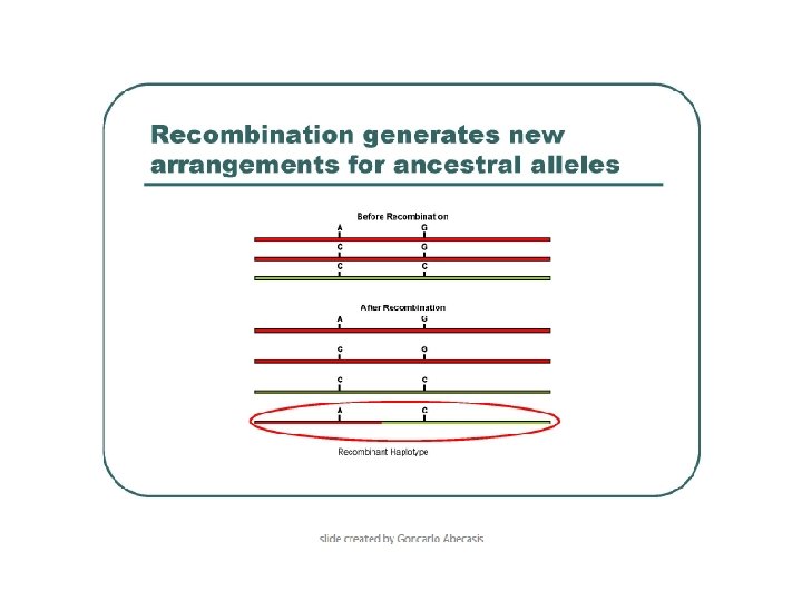 Scenario 1 SNP 1 A C C A SNP 2 C C G G Ancestral derived SNP 1 derived SNP 2 recombinant (not observed) Scenario 2 SNP 1 A C C A SNP 2 C G Ancestral derived SNP 1 and SNP 2 haplotype 1 haplotype 2