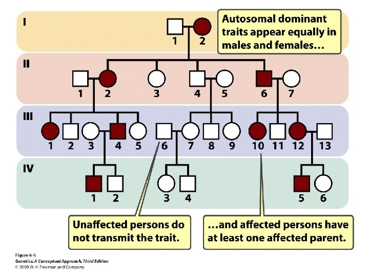 Autosomal dominant I II IV - the trait is found equally in both males and females every affected individual has at least one affected parent trait shows vertical pattern of inheritance, that is affected males and females are observed in each generation