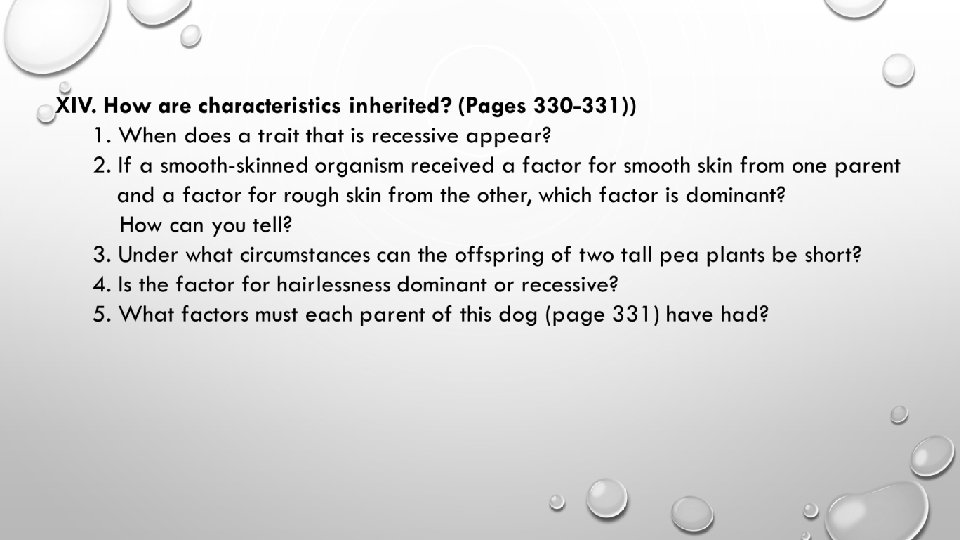 XIII. How are characteristics inherited? (Pages 328 -329) 1. What traits did the puppies on this page inherit from their parents? 2. Do all of the puppies look alike? 3. Did the puppy that looks different inherit traits from its parents? 4. How were two tall parents from the second generation of plants able to produce any short offspring? 5. Where do organisms get inherited characteristics? 6. What were the results in the first generation?