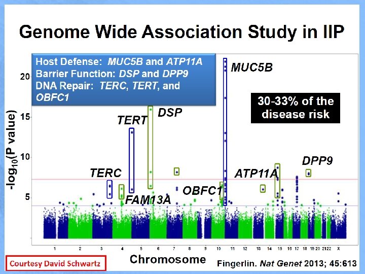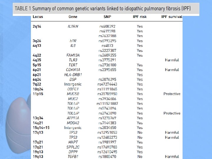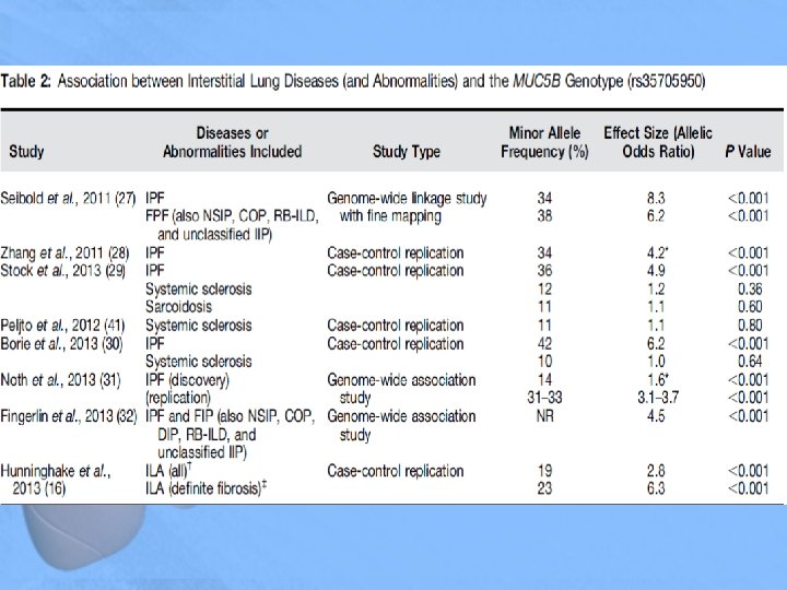 In 2011: MUC 5 B gene • A common polymorphism in the promoter of the MUC 5 B gene has been associated with both sporadic and familial IPF. • Associated with a 20 -fold increased risk of IPF in subjects that were homozygous for the polymorphism and a 7 -fold increased risk in heterozygous subjects. • At least one copy of the promoter polymorphism was present in 34 -38% of IPF subjects compared with 9% of healthy controls. s. Seibold et al. NEJM 2011 s. Zhang Y, et al. NEJM 2011