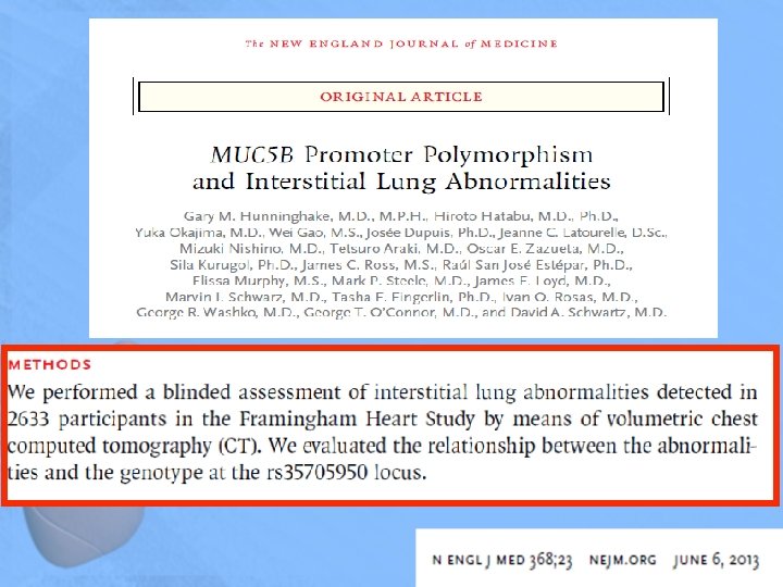 Hypothesis • It is not known whether this polymorphism is associated with ILD in the general population. • The relationship between ILA and the genotype at the rs 35705950 locus for a modification of effect according to age and smoking was evaluated. Hunninghake GM, et al. NEJM, June 2013