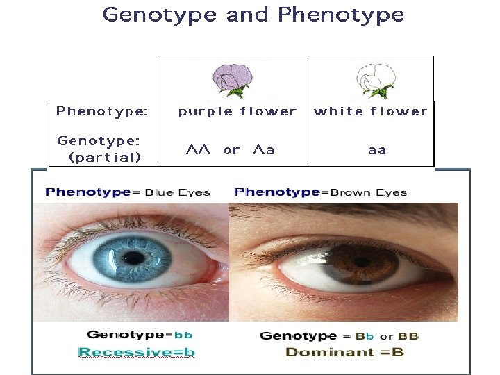 Genotype vs. Phenotype • Genotype - An organism’s genetic makeupcombination of alleles that determine the organism’s phenotype. • Phenotype - Outward
