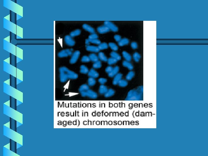 Genetic Disorders b B. ) Mutated Chromosome = damaged DNA, genes located in that section are damaged b Deletion: missing gene or piece of chromosome b Duplication: extra piece, genes duplicated b Translocation: gene switches chromosomes b Inversion: fragment of gene gets turned around