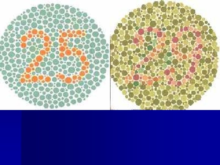 n 8% of men and 0. 5% of women have some form of deficiency (red-green). n A. K. A: protanopia (redblindness),
