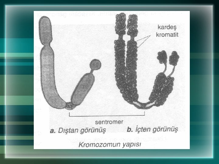 • Kromozomların şekli, büyüklüğü ve sayısı her tür için sabittir. Örneğin; insanda 46, buğdayda 42, soğanda 16, sirke sineğinde 8 kromozom vardır. Verilen örneklerde olduğu gibi kromozomlar çift sayıdadır. Kromozomun yapısında iki kardeş kromatit sentromerle birbirine bağlanmıştır.