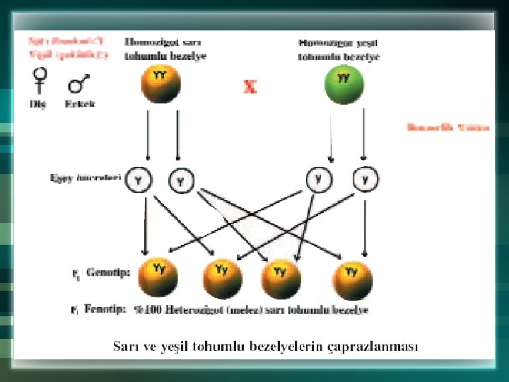 • Fenotipi yuvarlak tohumlu olan F 1 dölü bireyleri kendi aralarında çaprazlandığında elde edilen F 2 dölünün ¾’ü yuvarlak tohumlu, 1/4 ü ise buruşuk tohumlu olur. • Y : yuvarlak (baskın) • y : buruşuk (çekinik) Mendel, değişik karakterli bezelyeler üzerinde yaptığı çaprazlama deneyleri sonucunda kalıtımla ilgili olarak aşağıdaki ilkeleri bulmuştur.