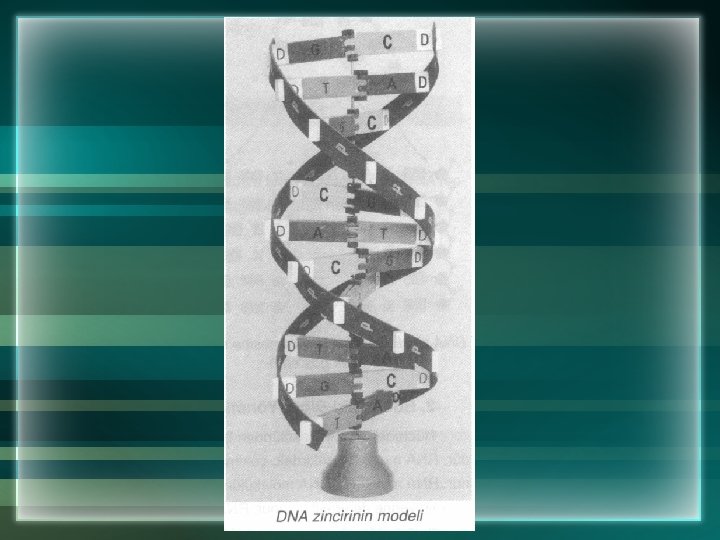 a. DNA Molekülünün Yapısı Nasıldır? • DNA'nın yapısı çok sayıda nükleotitten oluşmuştur. Her nükleotitin yapısında organik baz, şeker ve fosfat bulunur. Çift sarmal yapıda olan DNA, bir ip merdivenin kendi ekseni etrafında kıvrılmış hâline benzer. • Merdivenin DNA zincirinin modeli basamakları dört eşit organik bazdan oluşur. Bu bazlar adenin, timin, guanin ve sitozindir. Mer divenin basamakları yaadenin ile timinin birbirine iki bağ ile bağlanmasından (A=T) ya da guanin ile sitozinin birbirine üç bağ ile bağlanmasından (G=C) oluşmuştur. Bu harflerin temsil ettiği bazların dizilişi vücuttaki proteinlerin yapısını belirler. Proteinler, yaşamın yapı taşları olduklarından, hücrelerin yapısında yer alır. Hücreler de bir araya gelerek karmaşık yapılı canlıyı oluşturur. DNA'yı oluşturan nükleotitlerde deoksiriboz şekeri bulunur.