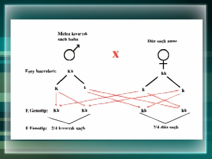 • Yukarıdaki çaprazlamada görüldüğü gibi çocukların genotipleri 2 / 4 ( % 50 ) melez ( heterozigot ) kıvırcık saçlı, 2 / 4 ( % 50 ) arı ( homozigot ) düz saçlı olur. Fenotipleri ise 2 / 4 ( % 50 ) kıvırcık, 2 / 4 ( % 50 ) düz saçlı olur. • Özelliklerin ayrılması yasasına göre, insanlarda da nesilden nesile aktarılan özelliklerden baskın olanı daha yüksek oranda görülür. Çekinik özellik ise daha düşük oranda ortaya çıkar.