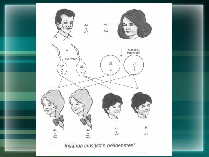 • Mayoz bölünme sonucunda oluşan eşey hücrelerinde 23 kromozom bulunur. Dişilerin yumurta hücreleri tek çeşittir ve (22+X) kromozomludur. Erkeklerin spermleri ise (22+X) ya da (22+Y) kromozomludur. • Eğer dişinin yumurta hücresi, erkeğin (22+Y) kromozomlu spermi ile birleşirse, (44+XY) kromozomlu erkek çocuk meydana gelir. Eğer yumurta hücresi, (22+X) kromozomlu sperm ile birleşirse (44+XX) kromozomlu dişi çocuk oluşur. Burada cinsiyeti belirleyen spermdeki X ve Y kromozomlarıdır. Bir toplumdaki erkek ve dişilerin sayıları yaklaşık birbirine eşittir. Çünkü bebeğin erkek ya da dişi olma olasılığı %50'dir.