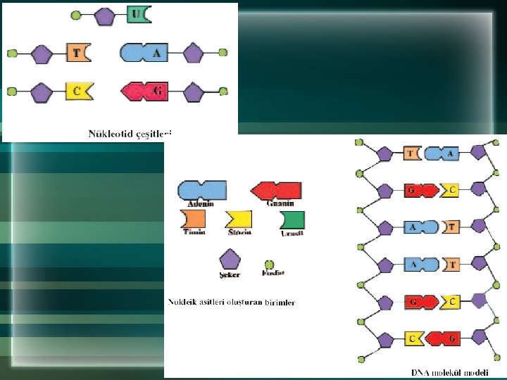HÜCREDE YAPI VE CANLILIK OLAYLARININ YÖNETİMİ NASIL SAĞLANIR? • 20. yüzyılın ilk yarısında yapılan çalışmalar, hücredeki hayat olaylarını düzenleyen moleküllerin nükleik asitler olduğunu göstermiştir. Nükleik asitler (yönetici moleküller) organizmanın bilgi deposudur. Saç rengimizden burun şeklimize ve kan gruplarımıza kadar birçok özelliklerimizin ortaya çıkmasında nükleik asitlerin etkisi vardır. Bu yüzden nükleik asitlere yönetici moleküller adı verilmiştir. • Yönetici moleküller (nükleik asitler) deoksiribonükleik asit (DNA) ve ribonükleik asit (RNA) olmak üzere ikiye ayrılır.
