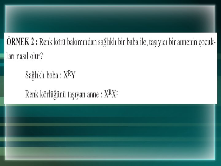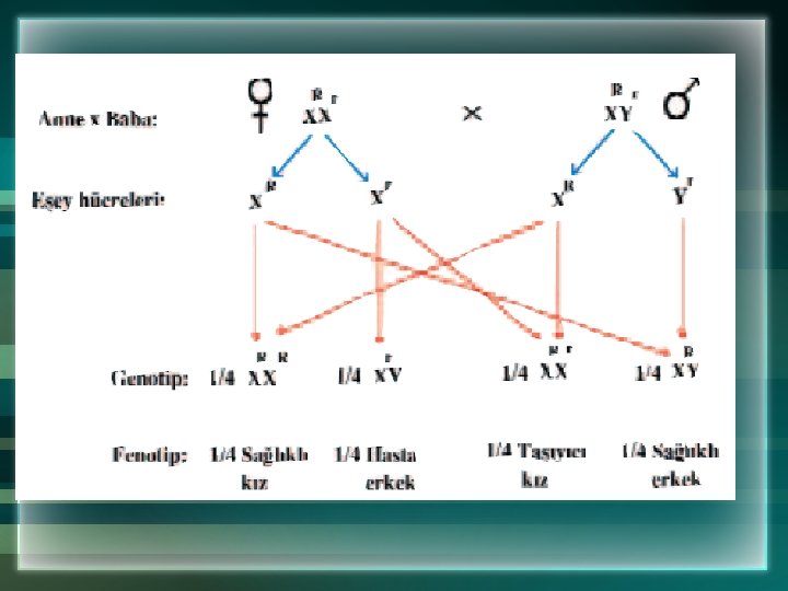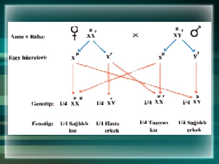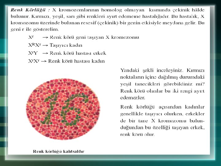 Kalıtsal Hastalıkların Yeni Nesillere Taşınması • Cinsiyet kromozomları renk körlüğü ve hemofili gibi kalıtsal hastalıkların genlerini taşır. Kalıtsal hastalıkların geni X kromozomları üzerinde bulunur. Hastalık taşıyan gen çekinik özellik gösterir. Erkek çocuk X kromozomunu annesinden, Y kromozomunu da babasından alır. Y kromozomu X kromozomundan biraz küçük olduğundan X kromozomundaki hastalık taşıyan genin etkisini bastıracak alel geni yoktur. Anneden hastalık genini alan erkek çocuklar hasta olur. Kız çocukların hasta olması için ise hastalık genini hem anneden hem de babadan almaları gerekir. Sadece anneden ya da babadan hastalık geni alan kız çocuk taşıyıcı olur. Bu nedenle erkek çocuklarda kalıtsal hastalık daha sık görülür.