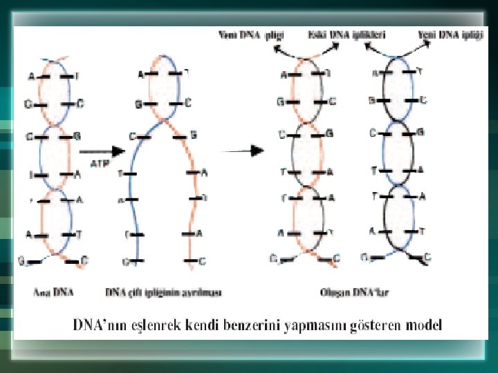 b. DNA'nın Özelliklerinden Birisi de Kendini Eşlemesidir • DNA canlının bütün genetik bilgilerini taşır. Hücre bölünmesi sırasında DNA kendini eşler. Eşlenme sonucunda başlangıçtaki DNA'nın tam benzeri iki DNA molekülü oluşur. DNA'nın kendini eşleme özelliği sayesinde, ana ve babanın karakterleri çocuklara aynen iletilir. DNA molekülünde, karşılıklı iki iplik bulunur. Bir DNA molekülü ancak bu iki ipliğin birlikte bulunmasıyla görev yapabilir. DNA molekülü, hücre bölünmesinden önce iki katına çıkar. Böylece DNA kendini eşler. DNA'nın kendini eşlemesinden sonra oluşan iki yeni hücre, ana hücre ile aynı genetik bilgiyi taşıyan DNA'ya sahip olur. DNA'nın kendini eşlemesi sırasında, iki ipliği bir arada tutan bağlar adeta bir fermuar gibi açılır.