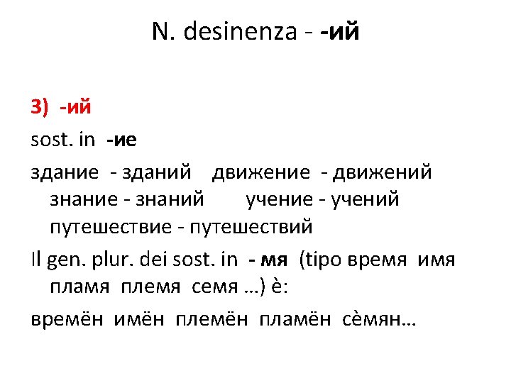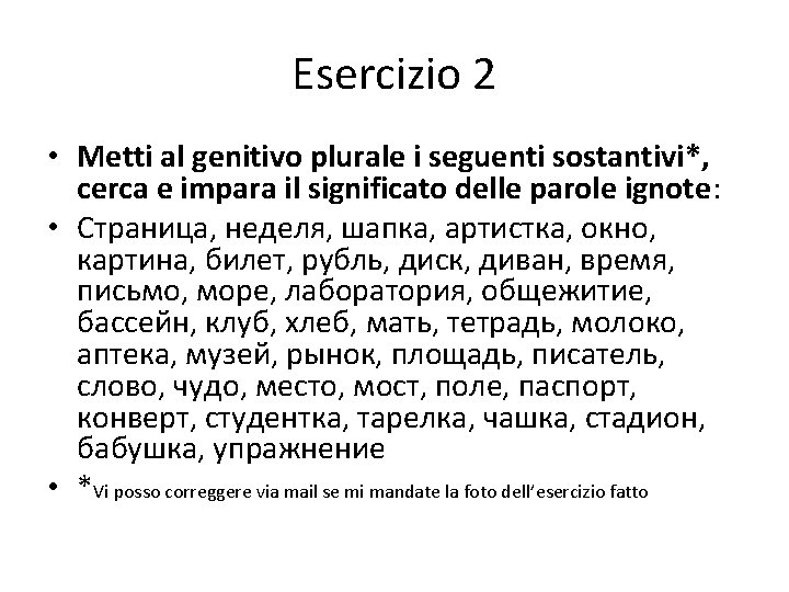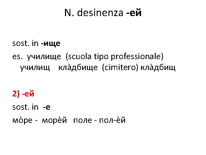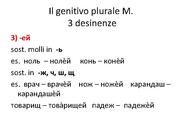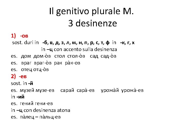 Il genitivo plurale N. 3 desinenze 1) -zero (ossia nessuna desinenza) sost. in -o es. прàвило (regola) прàвил винò (vino) вин мèсто (posto) мест лицо (viso) лиц яйцо (uovo) яиц селò (villaggio) сёл вèко (palpebra) век окнò (finestra) òкoн письмò (lettera) писем пятнò (macchia/lacuna) пятен cтеклò (vetro)стёкол N. B. Se in fine di parola si ha una sequenza consonantica, tra le 2 consonanti appare una /o/ oppure una /e/: es. окнò > *окн > окон; пятнò > *пятн >пятен; письмо > *письм > писем