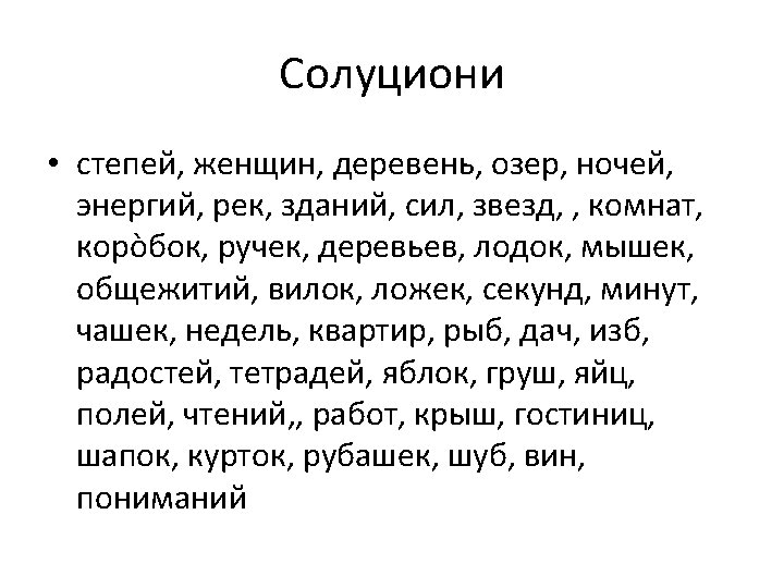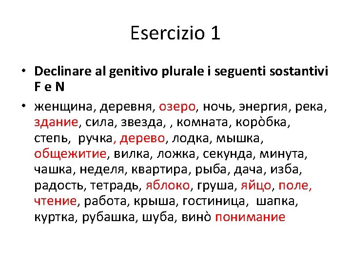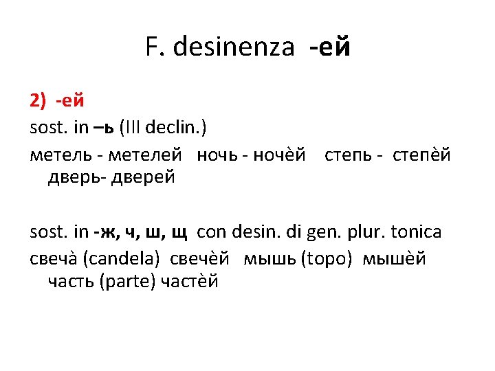 F. desinenza zero sost. in -ж, ч, ш, щ con accento sul tema душà (nom. plur. дýши) душ крыша (tetto) крыш тëща ( suocera) тëщ sost. in –я (desin. zero + ь finale) няня (balia) нянь буря (tempesta) бурь неделя (settimana) недèль N. B. se la parola finisce nella sequenza cons. +ля appare una –e: земля >земèль; пèтля > пèтель
