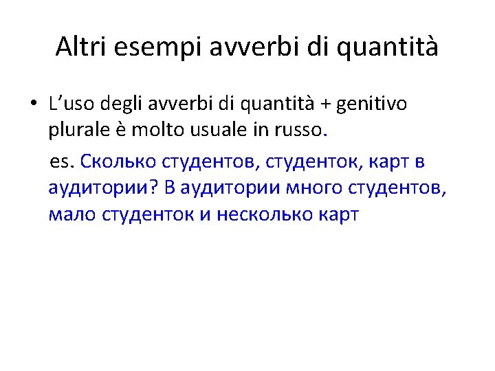 Uso del genitivo plurale dopo gli avverbi di quantità Mного (molto/i/tanto/i) Molti studenti много студентов мало ( poco/i) Pochi fratelli мало братьев сколько (quanto/i) Quanti eroi сколько героев несколько (qualche, alcuni) qualche donna нескольkо женшин немного (non molto/i) Non molti giorni немного дней