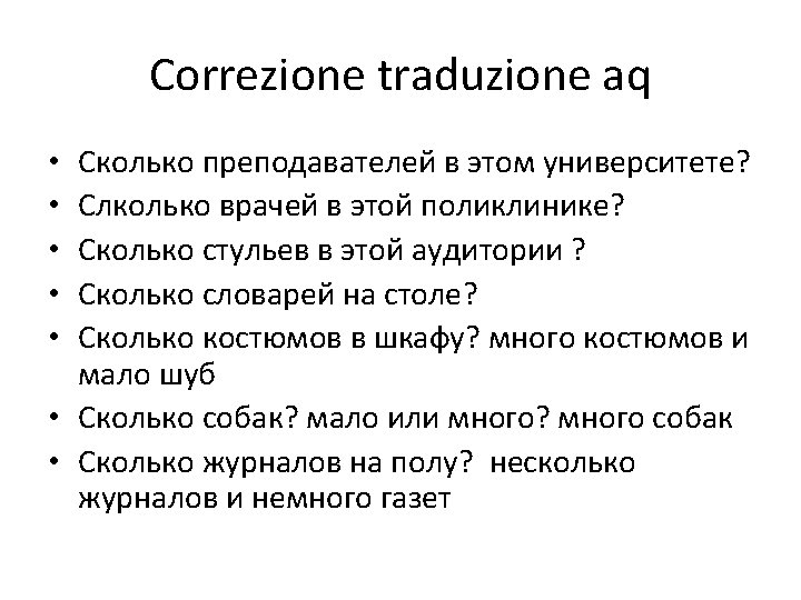 Traduzione aq Quanti insegnanti (ci sono) in questa università? Quanti medici (ci sono) in questo ospedale? Quante sedie in quest’aula? Quanti dizionari (ci sono) sul tavolo? Quanti vestiti nell’armadio? Molti vestiti e poche pellicce Quanti cani nel parco? Pochi o molti? Molti cani Quante riviste sul pavimento? Alcune riviste e non molti giornali