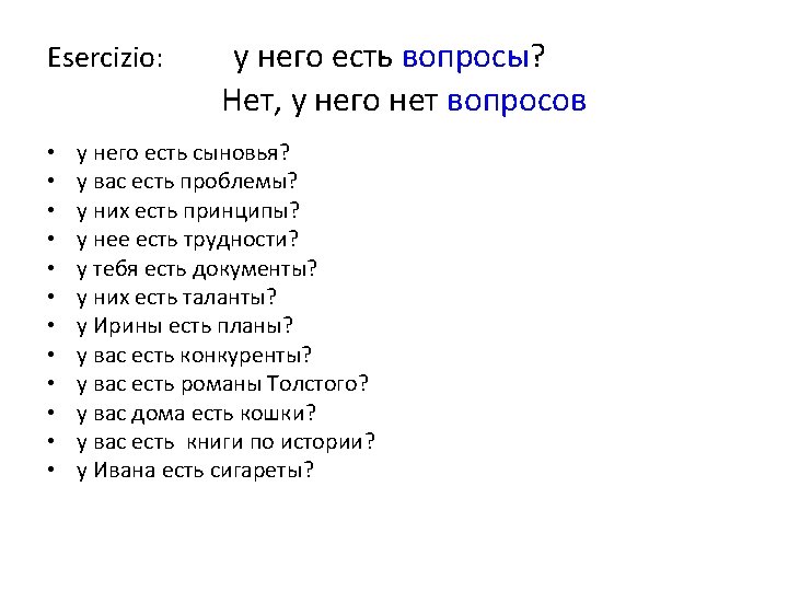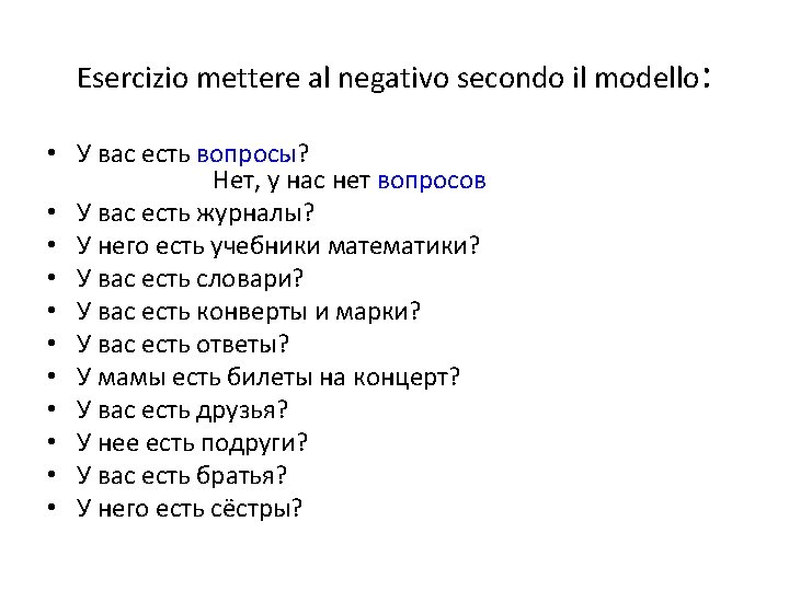 Usо del genitivo (sia singolare che plurale) nell’espressione del possesso negativo In russo la forma negativa di есть è нет. Нет quindi ha un doppio valore: 1. Nо, contrario di да 2. Contrario di есть, nell’indicazione del ‘non’ possesso. Dopo нет si mette il genitivo (o sing. o plur. ) У меня есть машина nom. sing. Ho una macchina У меня нет машины g. sing. Non ho la macchina у меня есть машины nom. plur. Ho le macchine у меня нет машин g. plur. Non ho le macchine у Ивана есть друзья nom. pl. Ivan ha gli amici У Ивана нет друзей g. plur. Ivan non ha amici У студента есть вопрос nom. sing. Lo studente ha una domanda У студента нет вопроса g. sing. Lo studente non ha una domanda У студента есть вопросы nom. pl. Lo studente ha domande У студента нет вопросов gen. pl. Lo studente non ha domande