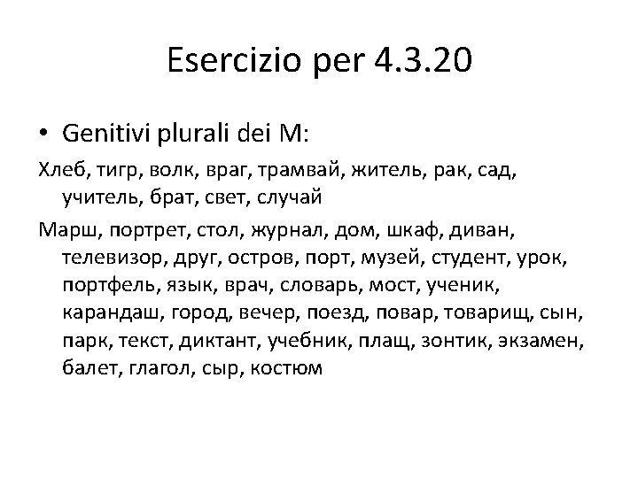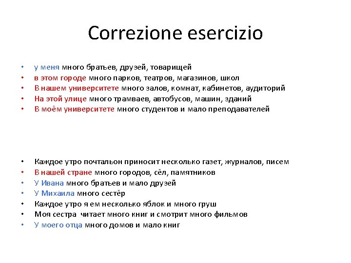 Esercizio gen. plur. • • • Ho molti fratelli, amici e compagni In questa città (ci sono) molti parchi, teatri, negozi, scuole Nella nostra università (ci sono) molte sale, stanze, studi, aule In questa strada (ci sono) molti tram, autobus, macchine, edifici Nella mia università (ci sono) molti studenti e pochi insegnanti Ogni giorno il postino (почтальон) porta alcuni giornali, riviste e lettere Nella nostra regione ci sono molte città, villaggi, monumenti Ivan ha molti fratelli e pochi amici Michail ha molte sorelle Ogni mattina mangio alcune mele e molte pere Mia sorella legge molti libri e guarda molti film Mio padre ha molte case e pochi libri