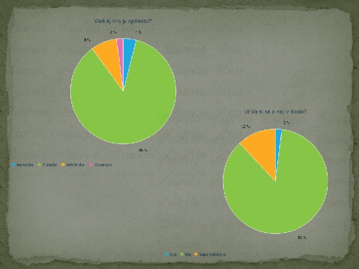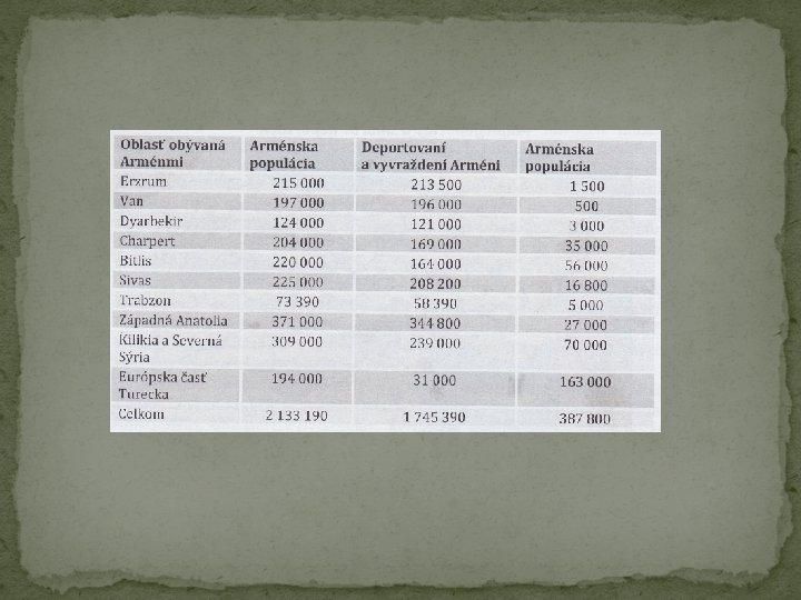 Zdroje: Knihy: VAHRAM CHUGURYAN: 100 rokov ticha, Banská Bystrica: Belianum, 2015. ISBN 978 -80 -5570874 -4 Internet: Arménská Genocida. In: cs. wikipedia. org [online]. 2017. [cit: 2017 -05 -18]. Dostupné na internete: ‹https: //cs. wikipedia. org/wiki/Arm%C 3%A 9 nsk%C 3%A 1_genocida› Arménska genocída: Jedna z najhorších genocíd histórie, počas ktorej Turci systematicky vyvraždili okolo 1 a pol milióna Arménov. In: refresher. sk [online]. 2017. [cit: 2017 -05 -18]. Dostupné na internete: ‹https: //refresher. sk/42864 -Armenska-genocida-Jedna-z-najhorsichgenocid-historie-pocas-ktorej-Turci-systematicky-vyvrazdili-okolo-1 -a-pol-miliona-Armenov› Prečo je potrebné hovoriť o genocíde Arménov. In: postoj. sk [online]. 2017. [cit: 2017 -05 -18]. Dostupné na internete: ‹https: //www. postoj. sk/4357/preco-je-potrebne-hovorit-o-genocidearmenov› 24. apríl - pamätný deň arménskej genocídy. In: chuguryan. blog. sme. sk [online]. 2013. [cit: 2017 -05 -18]. Dostupné na internete: ‹https: //chuguryan. blog. sme. sk/c/326807/24 -april-pamatnyden-armenskej-genocidy. html› Mt. Ararat. In: sacredsites. com [online]. 2017. [cit: 2017 -05 -18]. Dostupné na internete: ‹https: //sacredsites. com/images/middle_east/turkey/mt-ararat-600. jpg› Armenian genocide. In: armenian-genocide. org [online]. 2017. [cit: 2017 -05 -18]. Dostupné na internete: ‹http: //www. armenian-genocide. org/genocidefaq. html› Genocide education. In: genocideeducation. org [online]. 2017. [cit: 2017 -05 -18]. Dostupné na internete: ‹https: //genocideeducation. org/background/brief-history/›