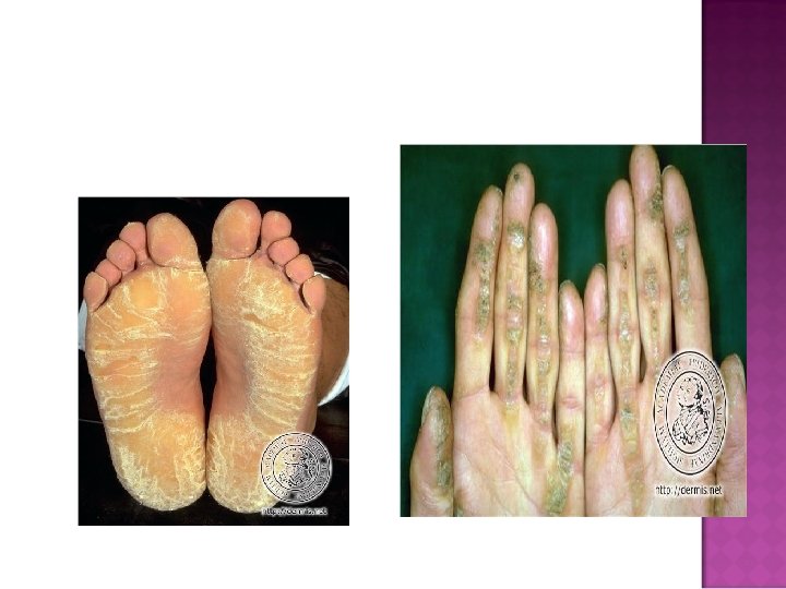 IKTIOSIS VULGARIS PALING UMUM Autosomal dominan, Insidensi 1: 250 - 1: 1. 000 kelahiran Melibatkan kedua seks seimbang Mulai sebagai kulit kering s. d sisik ikan. Lengan dan tungkai jarang di daerah fleksura. Aksentuasi garis palmar dan plantar. Produksi skuama diduga daya ikat lamela keratin. Rambut rontok, distrofi kuku, insidensi pd gangguan atopik