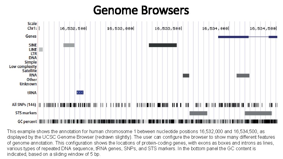 Genome Browsers This example shows the annotation for human chromosome 1 between nucleotide positions 16, 532, 000 and 16, 534, 500, as displayed by the UCSC Genome Browser (redrawn slightly). The user can configure the browser to show many different features of genome annotation. This configuration shows the locations of protein-coding genes, with exons as boxes and introns as lines, various types of repeated DNA sequence, t. RNA genes, SNPs, and STS markers. In the bottom panel the GC content is indicated, based on a sliding window of 5 bp.