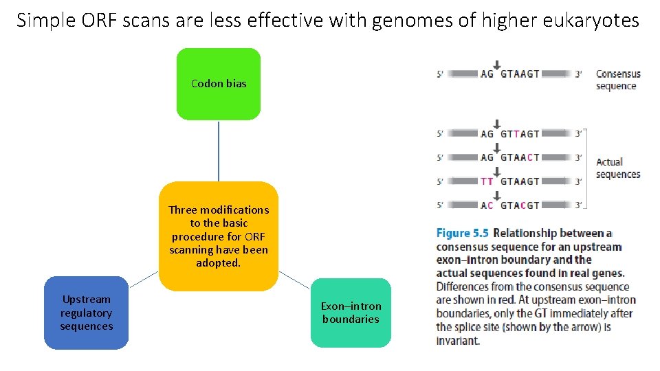 Simple ORF scans are less effective with genomes of higher eukaryotes Codon bias Three modifications to the basic procedure for ORF scanning have been adopted. Upstream regulatory sequences Exon–intron boundaries